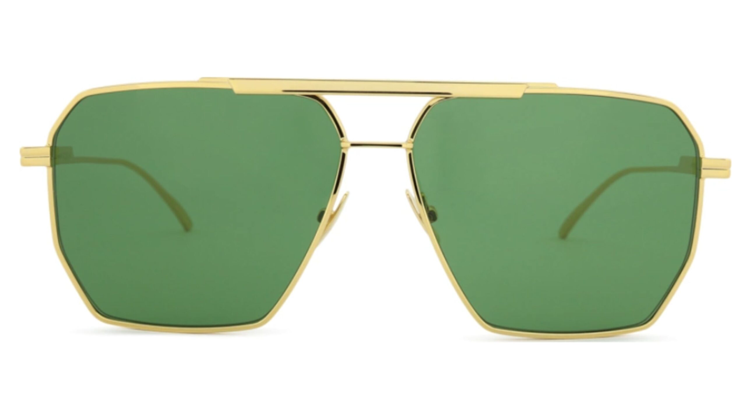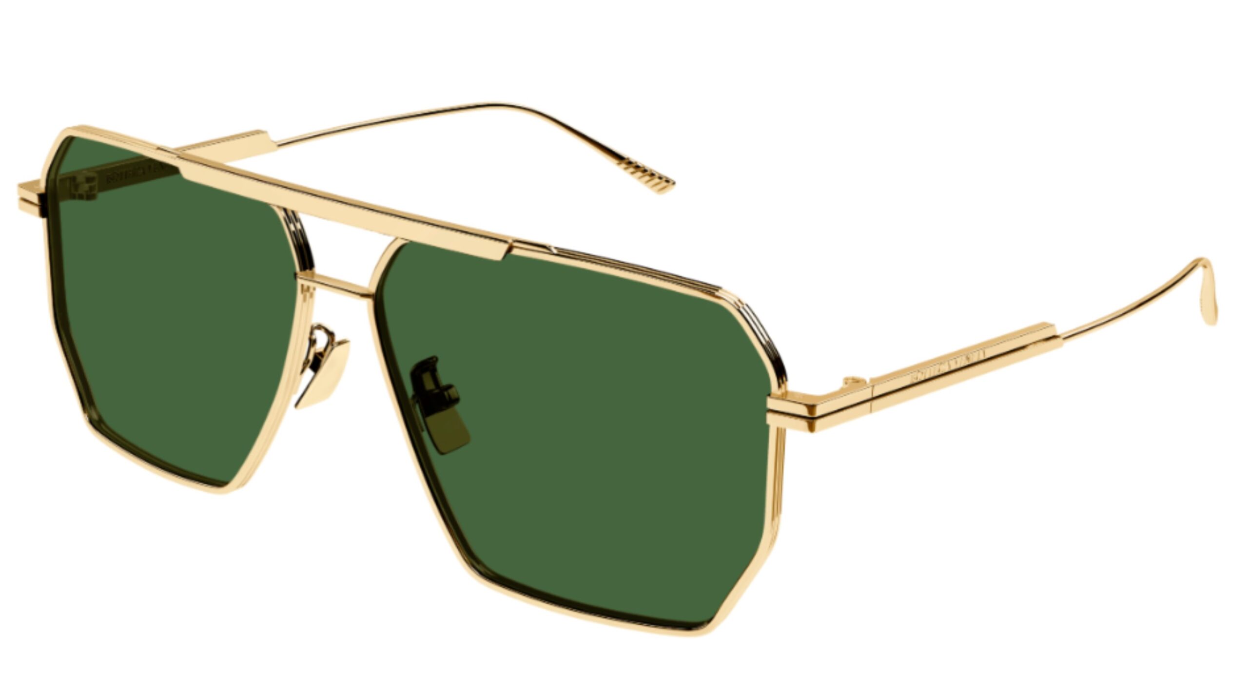 Model Bottega Veneta BV1012S 004 to wyrazisty, luksusowy projekt inspirowany klasycznym stylem aviator w nowoczesnym, geometrycznym wydaniu. Okulary przyciągają uwagę złotą, metalową konstrukcją oraz charakterystycznymi, lekko kanciastymi soczewkami w eleganckim, zielonym odcieniu.